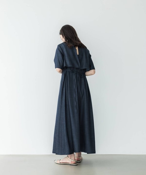 後ろ身頃に施したケープとバックオープンのデザインがポイントです。