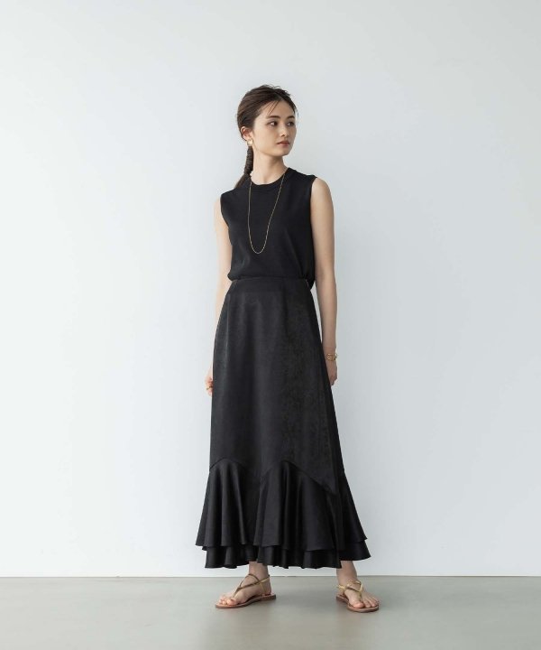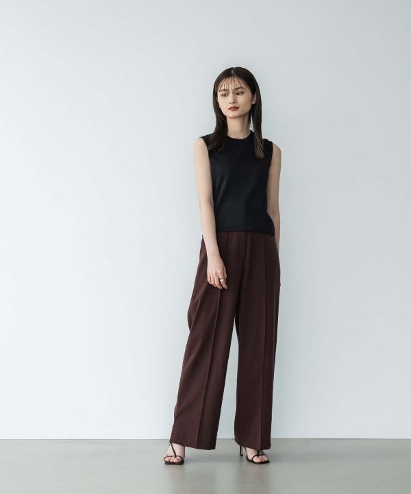 ラメ糸を織り込んだバックデザインがポイントのノースリーブニット。